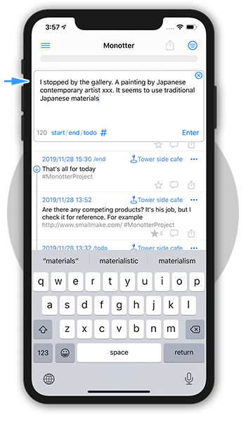 Monnotter is a life log application by monologue. It doesn't share online. The name of 'Monotter' was combined with 'monologue' and 'shita' which is Japanese verb past tense conjugation. You can write immediately after startup.