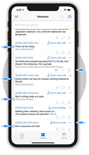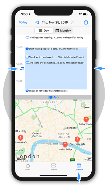 You can look over the texts on the time table of the day. The events show the start to end range box. This event can be output to iPhone Calendar app with the button. This is useful if you use a calendar as a life log.