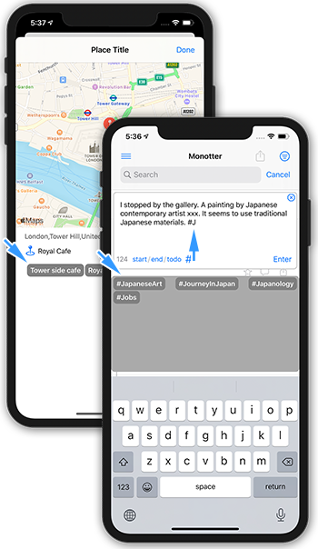 Record the location (GPS) where entering the text. Places can be named and reused in texts at the same place. Text can have the "START" "END", and "TODO" "DONE" status by inserting the prefix /start /end /todo /done at the beginning of the text. “Start” and “End” are treated as events in the set and the event can be output to the calendar. “TODO” status displays a check box. You can tap the check box to change it to the “DONE” status. You can set a rate value for monologues as importance. The list can be sorted by date as well as by rate.