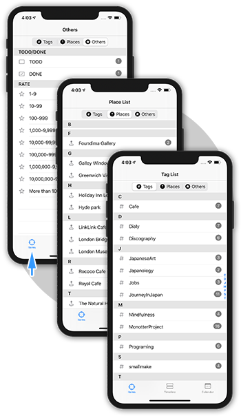 List the tags and location names you are using, and search with a tap. The number of these usages are displayed. TODO / DONE and rates are also listed with use count and can be searched by a tap.