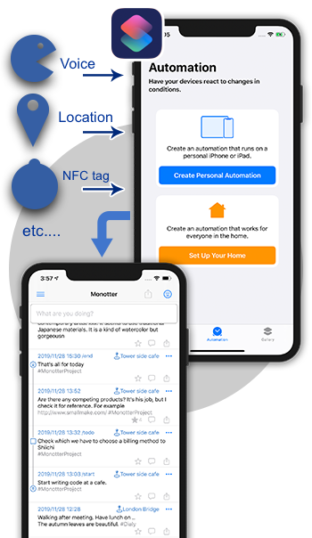 Automated monologues can be added as fixed-form sentences (for example, Arrive at office, Take medicine, etc.) using voice commands, location or NFC tags.