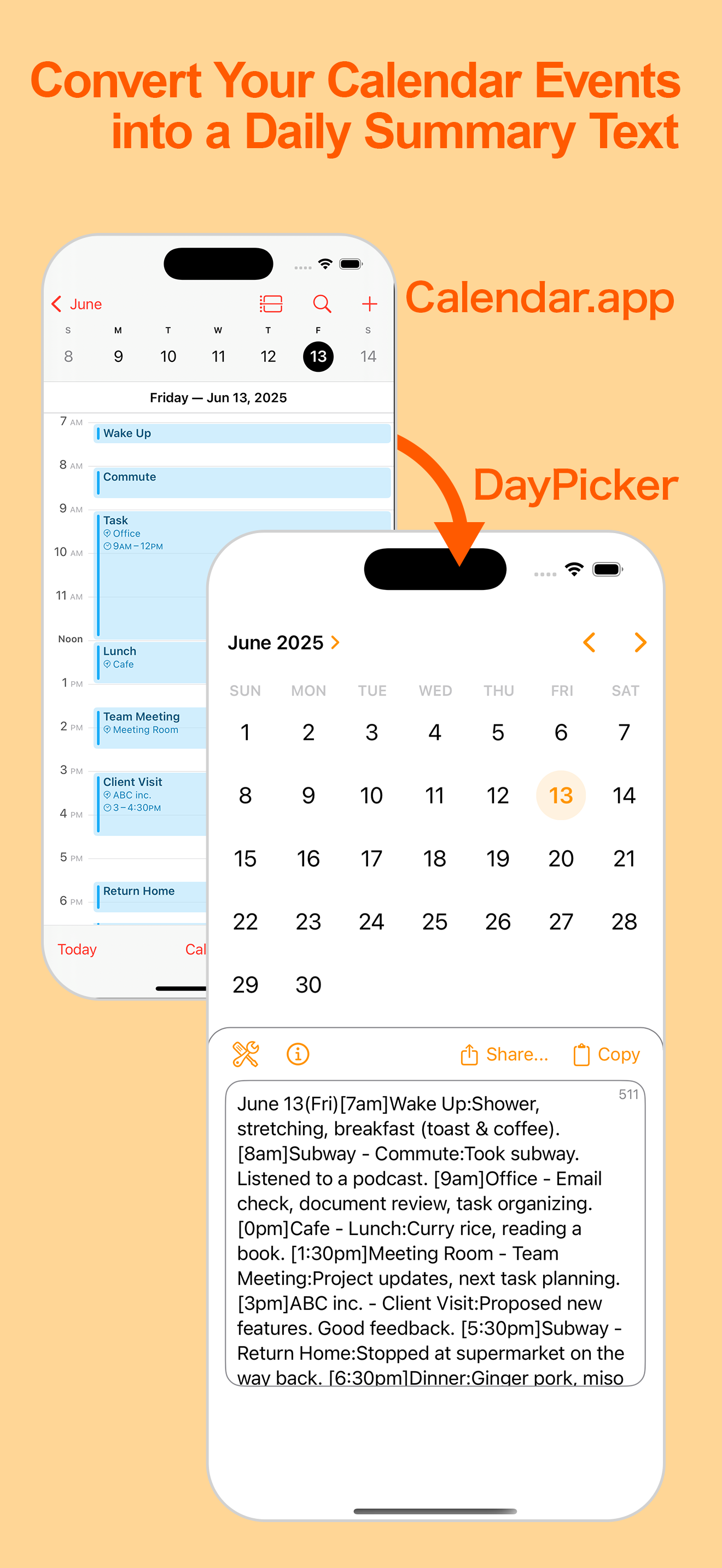 DayPicker is an app that transforms your scheduled events from the iPhone Calendar into a single, easy-to-read text summary for each day. Meetings, tasks, outings—daily events are formatted into clean, concise text that you can copy or share to other apps. Perfect for drafting daily logs or personal journals.