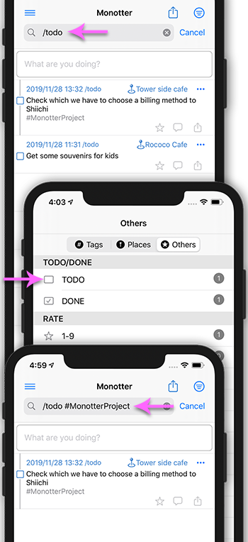 If you enter "/todo" in the search field, TODOs with check boxes can be displayed.