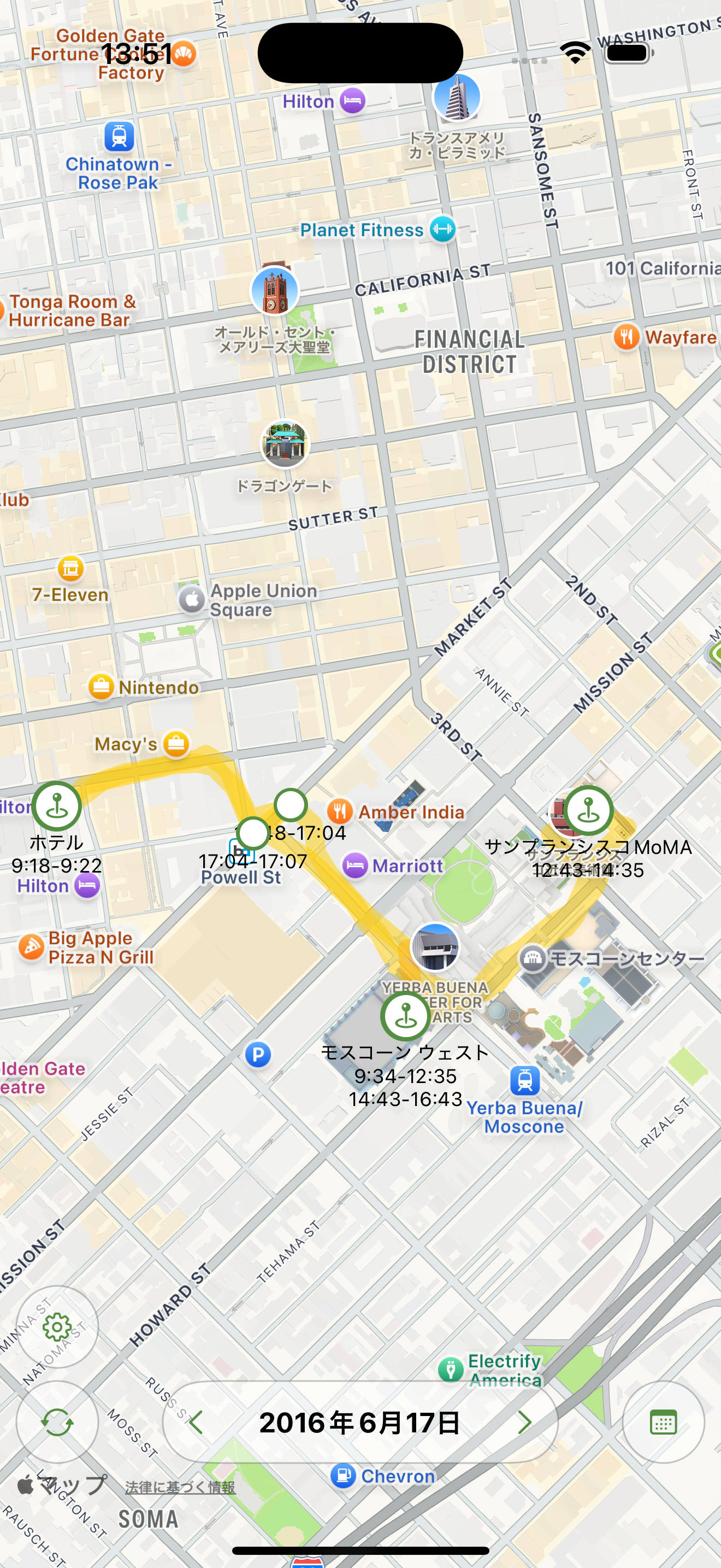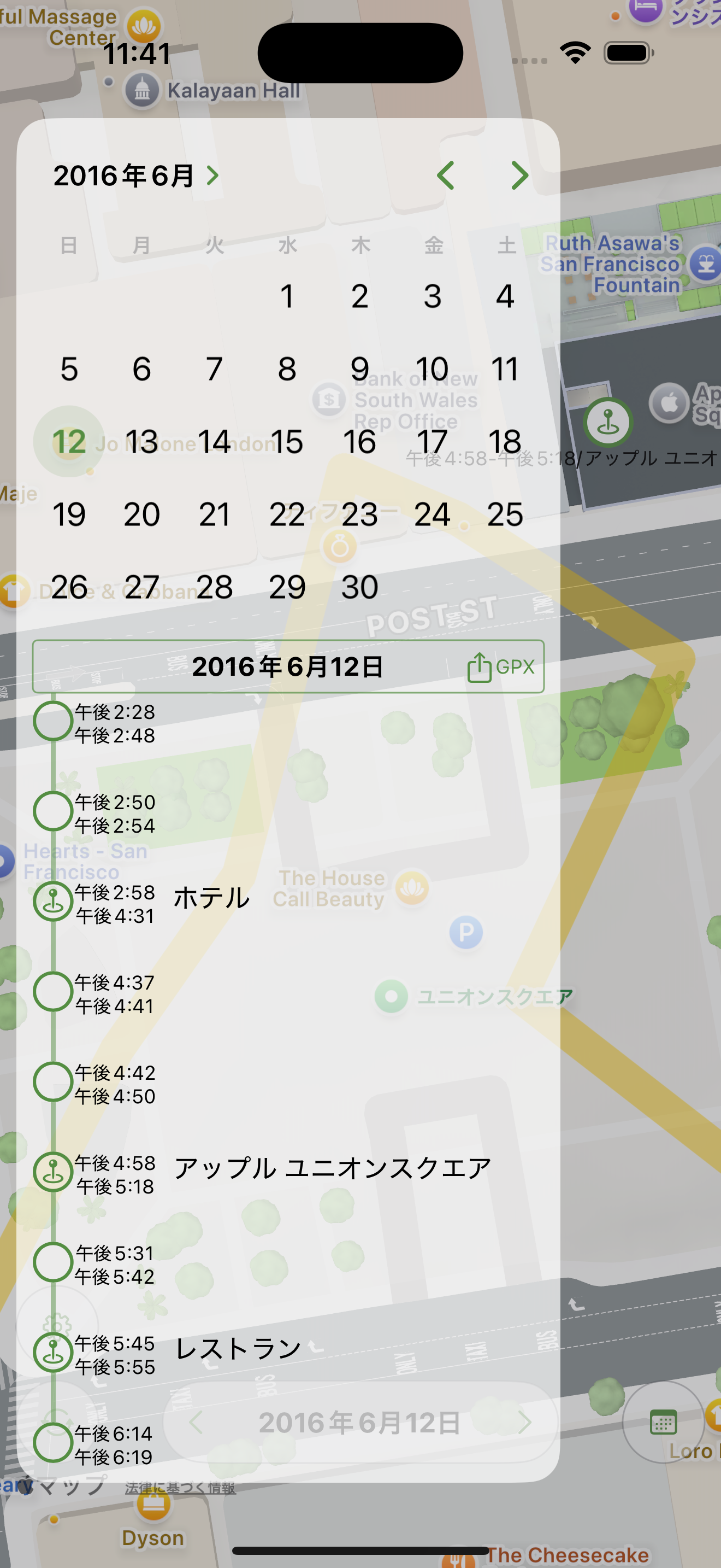 カレンダーから日付を選んで、その日の移動履歴を確認。 滞在一覧表示。滞在地点をタップすると地図がその場所をフォーカス。