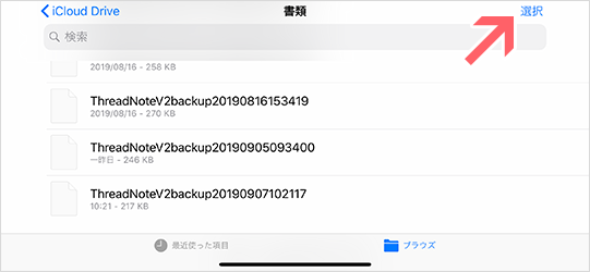 2)iCloud Driveの「書類」フォルダを開くと、保存したバックアップの一覧があります。右上の「選択」ボタンをタップ。