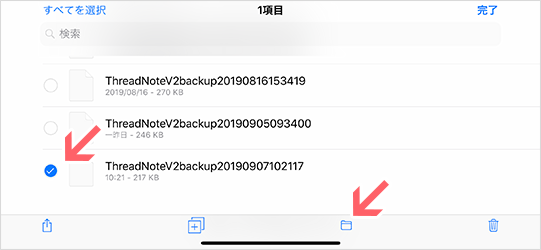 3)ThreadNoteへ持って行きたいファイルを選択して、下のフォルダアイコンをタップ。